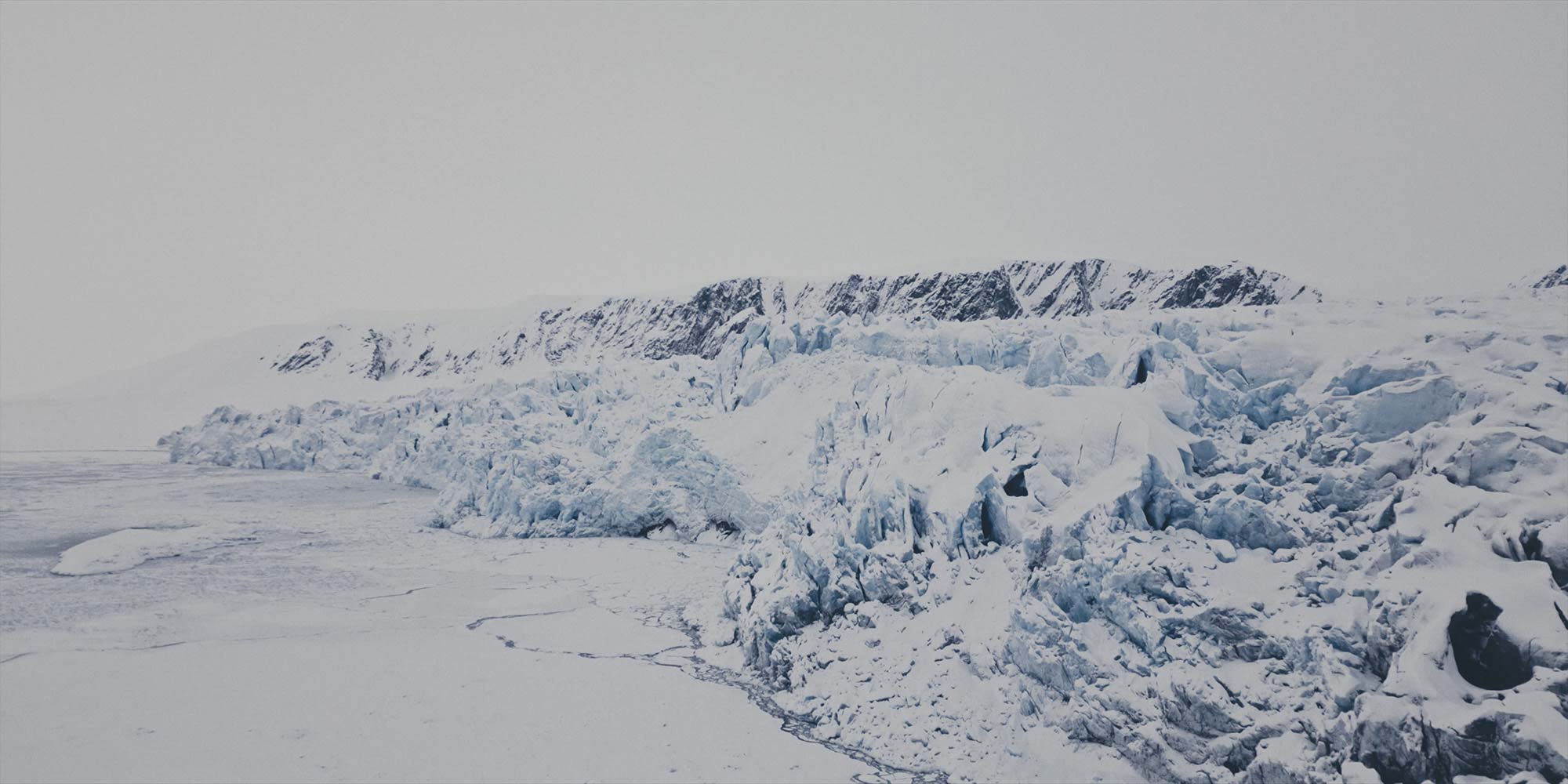 Everyone, until we climbed the short wall dividing the land from the sea, started walking as on thin ice, which ironically was true in this moment. Some five or ten minutes later we took the last steps around the moraine, and ahead lay a gigantic glacier front — a worthy finale to all the glacier fronts we saw on this trip. My drone again was in the air in no time, and from above I saw the massive blocks of blue ice coming down from the mountains and straight into the sea.