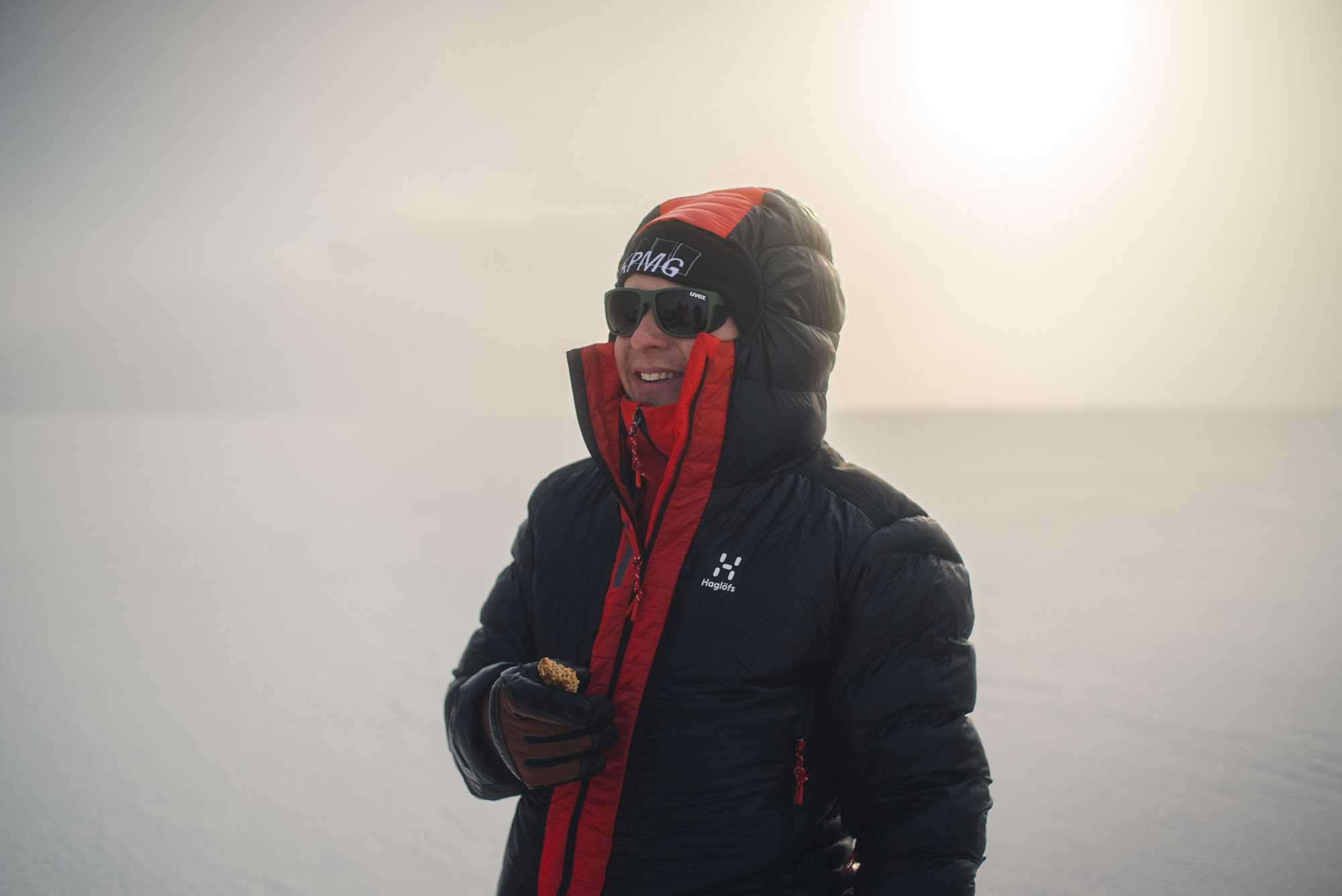 It felt quite nice to be on the glacier again. Although the temperature fell to about -20 °C at some points, I really enjoy being up here. Some minor uphills followed our perfect campsite, but no extraordinary steeps like the days before. Walking in general in this area was rather boring, though. Here, in the north, the glacier is nothing but a giant white area; not even scenic mountains are to be seen. I was feeling generally good, but my motivation for filming was again at a low point; I got some beauty shots, but real storytelling was not there.