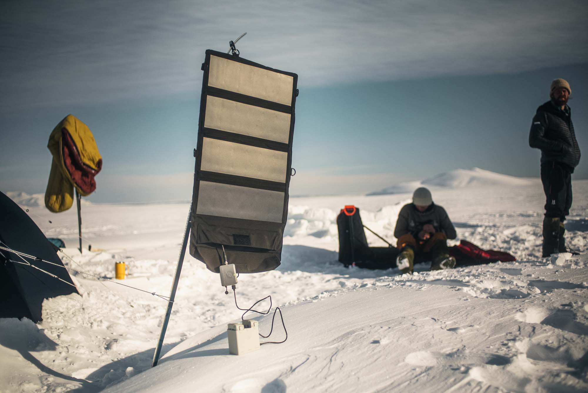Where should I put my giant, self-made power bank to charge my equipment? What even needs charging? Are the batteries too cold to charge? Should I film now — or crawl into the tent and try to warm up as fast as possible?